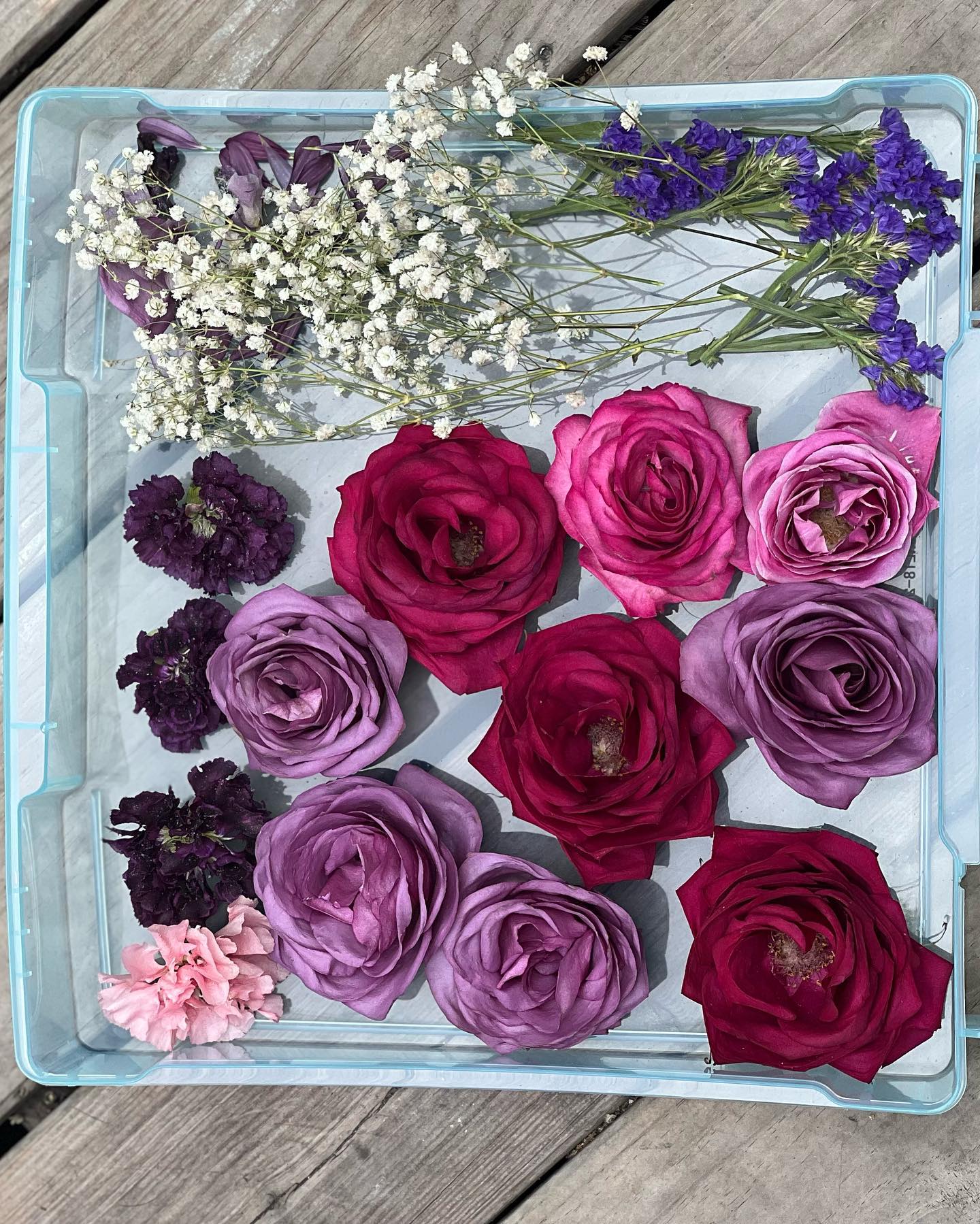 At Resin Vibes, we take great care in preserving your precious blooms to ensure they maintain their beauty for years to come. Your flowers are meticulously dried using silica gel, a method that helps retain vibrant colors and preserves their shape. This process takes several weeks, allowing us to achieve the best possible results.