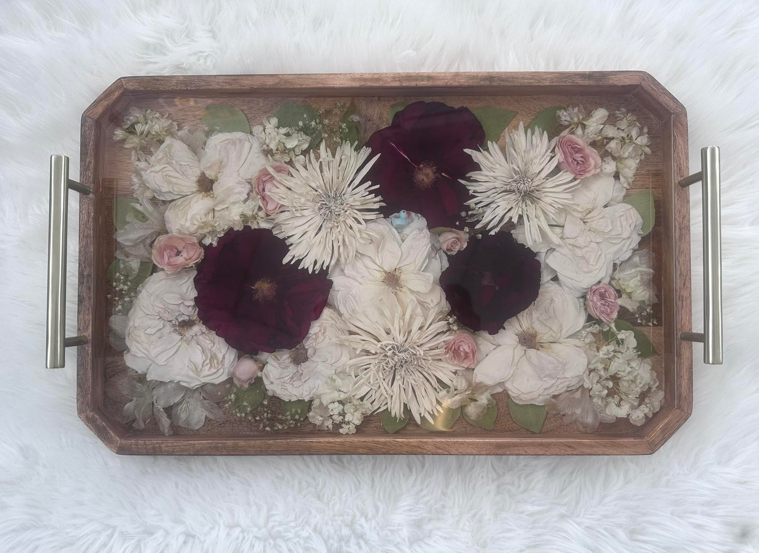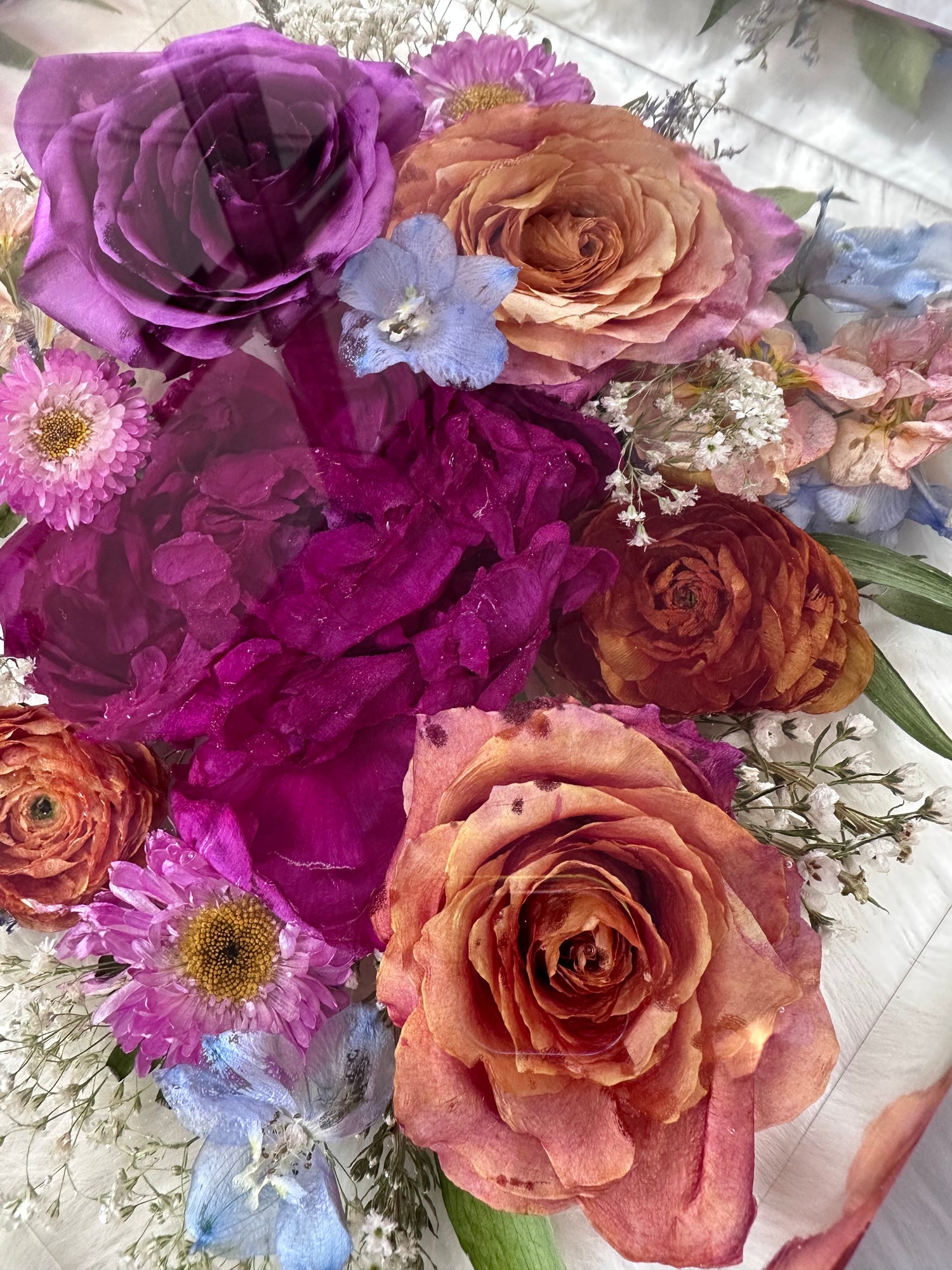 Please note that small imperfections and microbubbles are common in resin, adding to the organic nature of the piece. Over time, resin may develop an amber hue, especially when exposed to direct sunlight. To help maintain the timeless beauty of your keepsake, we highly recommend using a pigmented background, which will not only enhance the colors but also mitigate the effects of aging.