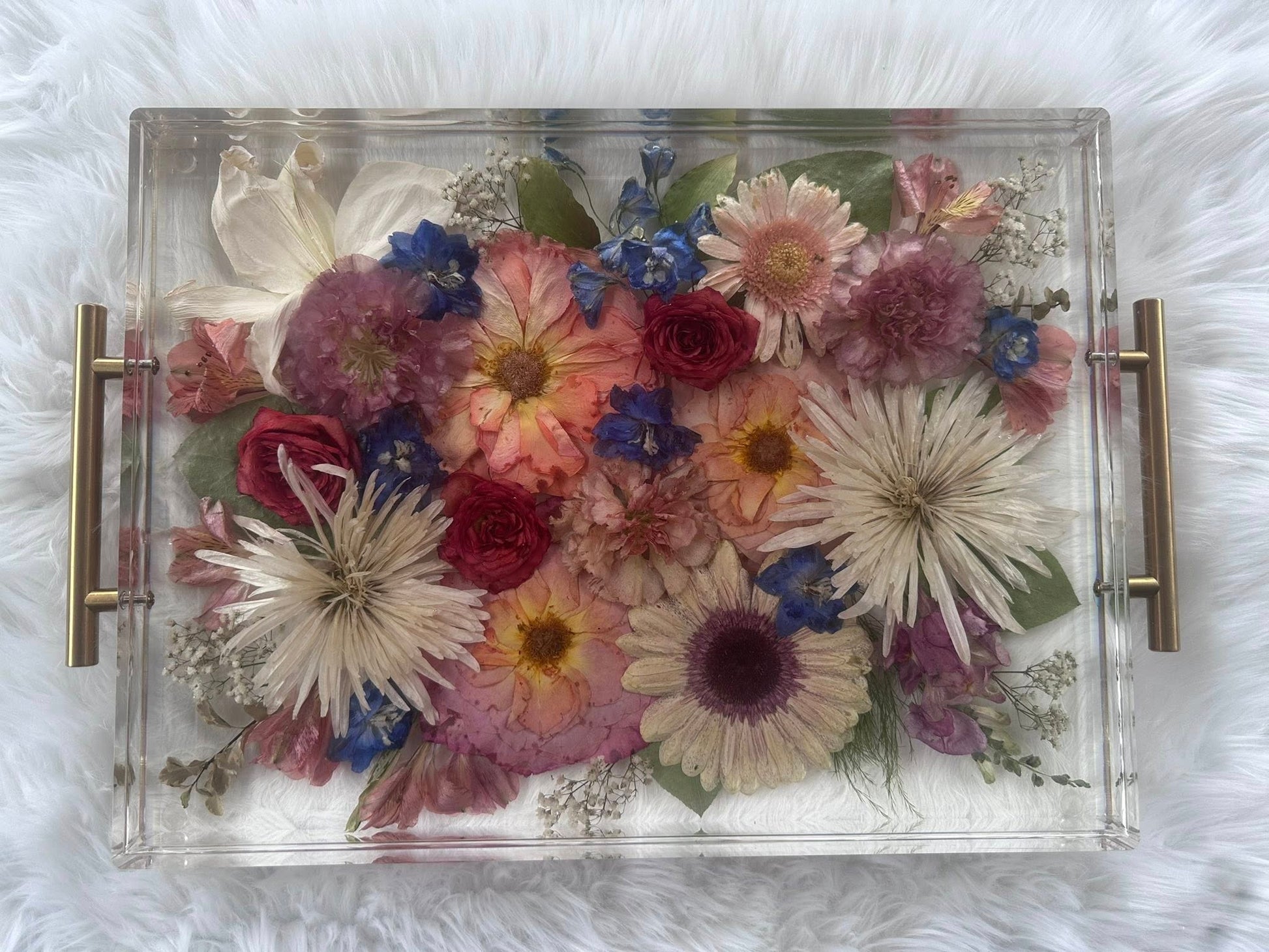 NOTE: Before purchasing please read our process and shop policies. Your flowers will be semi-pressed to best fit on the tray. This is a display piece as resin can be easily scratched. Email Maria, Artist and Floral designer at resinvibeskzoo@gmail.com for availability. We only take a limited amount of floral orders each month.