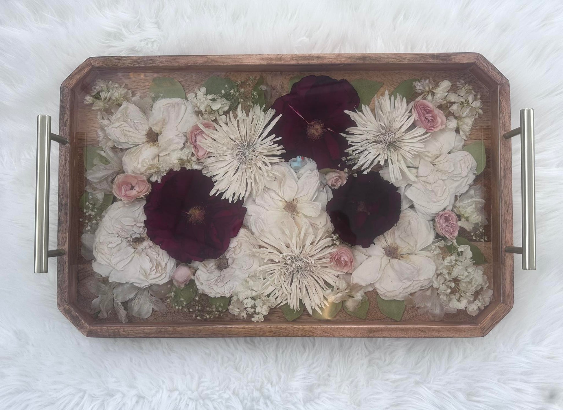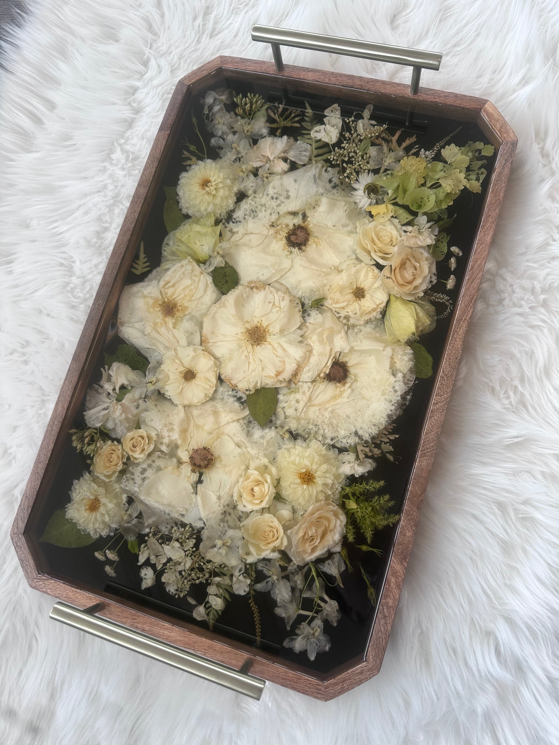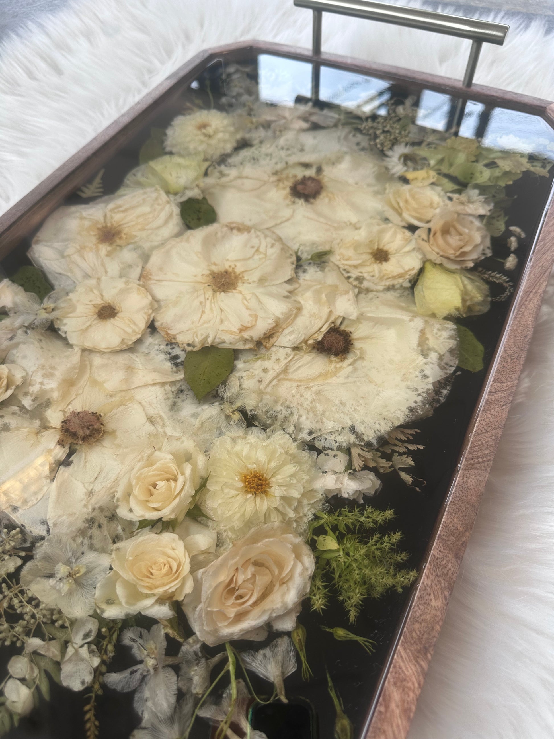 NOTE: Before purchasing please read our process and shop policies. Your flowers will be semi-pressed to best fit on the tray. This is a display piece as resin can be easily scratched. Email Maria, Artist and Floral designer at resinvibeskzoo@gmail.com for availability. We only take a limited amount of floral orders each month.